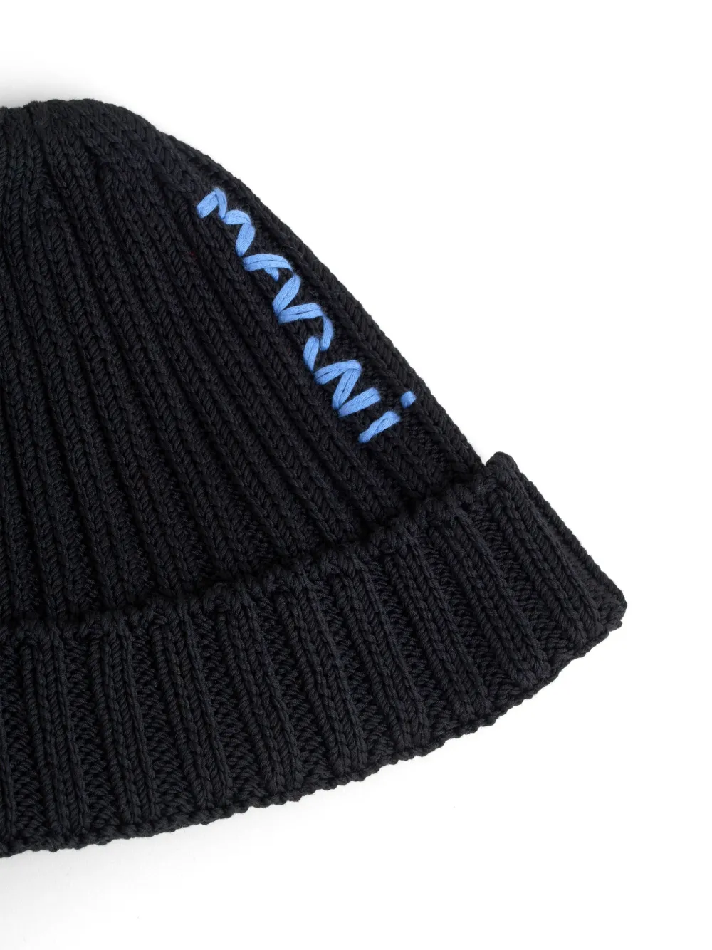 Cashmere navy beanie featuring an embroidered logo mended at side seam.Â